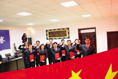 2 月25 日,岢嵐縣檢察院舉辦首批入額檢察官宣誓儀式。該院是忻州市檢察系統(tǒng)2015 年司法體制改革首批試點(diǎn)單位。一年以來,經(jīng)過層層選拔,首批10 名檢察官脫穎而出,市檢察院和岢嵐縣人大、政協(xié)領(lǐng)導(dǎo)到場(chǎng)祝賀,希望入額檢察官擔(dān)當(dāng)重任,充分發(fā)揮職能作用,維護(hù)好社會(huì)公平正義。(程玉光 攝)