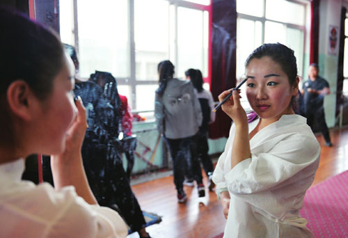 如今的太雨琴是一名北路梆子劇團(tuán)的演員,隨著走向社會(huì),她越發(fā)感覺(jué)到肩頭的重任。傳統(tǒng)戲劇,尤其是北路梆子這樣的地方少數(shù)劇種,那種萬(wàn)人爭(zhēng)睹的景象已經(jīng)一去不復(fù)返了?,F(xiàn)在除了一些縣鄉(xiāng)的節(jié)日慶典,很少有人愿意花錢(qián)到劇場(chǎng)觀看。這樣一來(lái),北路梆子也就面臨著演出市場(chǎng)萎縮、大量演員流失的狀況。與其說(shuō)太雨琴在靠戲曲吃飯,不如說(shuō)她在用信念堅(jiān)持。(何光暉 攝影報(bào)道)