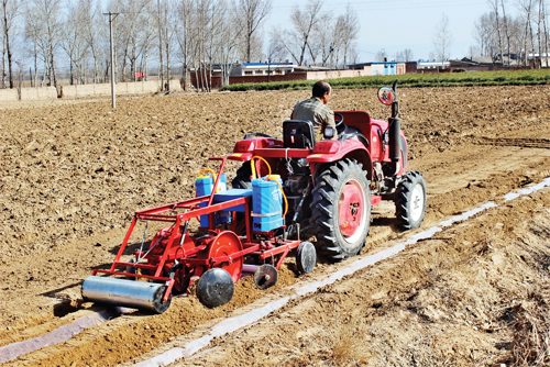 4月6日,原平市蘇龍口鎮(zhèn)計明農機合作社農民正在用集水鋪膜精播機播種旱地玉米。由原平四維農機公司制造的集水鋪膜精播機可種植旱地玉米、高粱、谷子等多種農作物,鋪膜下種一次完成,由于所鋪地膜中間形成凹槽,有利于收集雨水滲入禾苗根部,大大提高了旱地作物抗旱能力,受到山區(qū)農民歡迎。(曹申義 攝)
