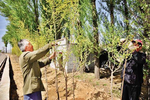代縣縣委、縣政府堅(jiān)持“生態(tài)綠色發(fā)展,共建美好家園”的執(zhí)政理念,今春鋪開(kāi)了總投資1120 萬(wàn)元的108 國(guó)道東段通道綠化工程、投資2000 多萬(wàn)元的鞏固退耕還林項(xiàng)目干果經(jīng)濟(jì)林工程和京津風(fēng)沙源治理工程以及全民義務(wù)植樹(shù)工程,切實(shí)做到規(guī)劃高起點(diǎn)、施工高質(zhì)量、建設(shè)高標(biāo)準(zhǔn)、開(kāi)發(fā)高效益。代縣作為京津地區(qū)的風(fēng)沙源頭,通過(guò)歷年堅(jiān)持不懈的生態(tài)綠化,全縣已擁有林地面積171 萬(wàn)畝,占到總國(guó)土面積的66.3%,基本實(shí)現(xiàn)了“春季花滿坡、夏季綠蔭濃、秋季五彩畫(huà)、冬季松柏青”的美好愿景,為京津地區(qū)筑起了防風(fēng)固沙綠色屏障。圖為工人們?cè)谛藜魳?shù)株。(石俊文 攝)