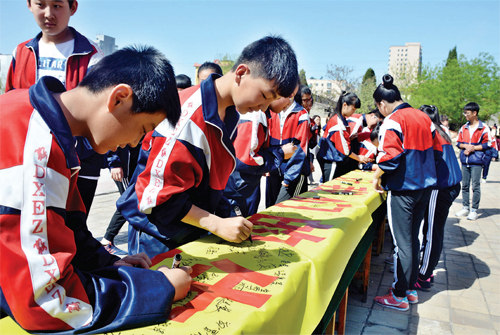 近日,第五屆“定襄讀書月”活動啟動儀式上,定襄第二中學的學生們紛紛在“讀書,讓生活更美好”的條幅上簽名,倡議多讀書讀好書。(劉小苗 攝)