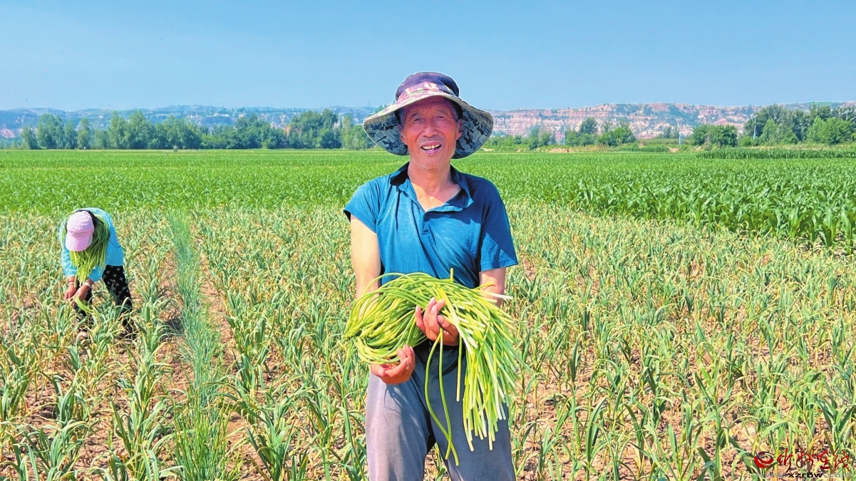 鄉(xiāng)村要振興,產(chǎn)業(yè)是關(guān)鍵支撐。眼下,正值河曲縣蒜薹成熟的時節(jié)。在西口鎮(zhèn)唐家會村的田間地頭,連片的蒜苗映入眼簾,一股濃濃的蒜香撲鼻而來。蒜農(nóng)們正俯身穿梭在蒜壟間,隨著手上一連串熟練的動作,一根根新鮮嫩綠的蒜薹被快速抽出。看著手中又粗又長的蒜薹,蒜農(nóng)們臉上洋溢著豐收的喜悅。蒜農(nóng)搶農(nóng)時、忙采收、話振興,小小紫皮蒜為鄉(xiāng)村發(fā)展注入了強勁活力。