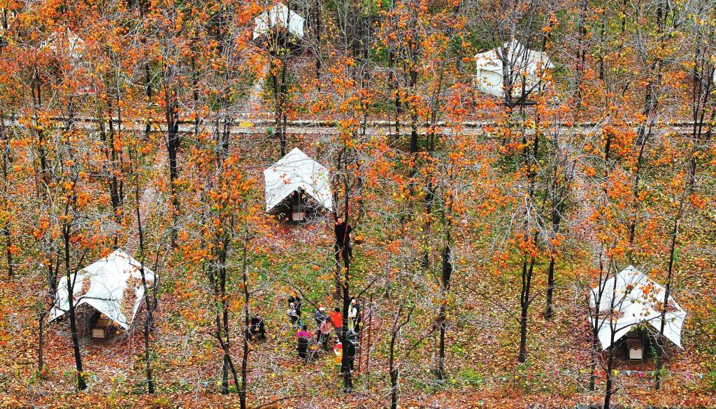 樹上生產(chǎn)力,樹下購買力。霜降時節(jié),位于定襄縣東峪自然保護(hù)區(qū)戎家莊的露營基地柿林內(nèi),村民忙著在樹上摘柿子,游客等著在樹下買柿子,給這個美麗的秋天,編織出一幅祥和的圖景。(張晉蘭 攝)