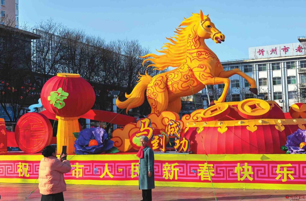 馬年春節(jié)的腳步越來(lái)越近了,忻州城區(qū)張燈結(jié)彩,處處洋溢著節(jié)日的喜慶氣氛。圖為市民在城區(qū)日月廣場(chǎng)與馬年迎春花燈合影。(記者張存良攝