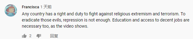 “任何國(guó)家都有權(quán)利和義務(wù)打擊宗教極端主義和恐怖主義。要根除這些邪惡……教育和獲得體面工作的機(jī)會(huì)也是必要的?!苯?,一名海外網(wǎng)友Francisca在看完中央廣播電視總臺(tái)旗下CGTN播出的《巍巍天山——中國(guó)新疆反恐記憶》紀(jì)錄片后這樣評(píng)價(jià)。