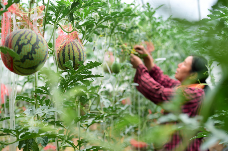▲5月7日,在河北省石家莊市靈壽縣三圣院鄉(xiāng)木佛莊園有機蔬菜種植基地,農(nóng)戶在管護大棚西瓜。