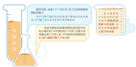 利用核酸檢測(cè)開展大范圍篩查,是精準(zhǔn)防控疫情的有效手段。省衛(wèi)健委醫(yī)政醫(yī)管局四級(jí)調(diào)研員趙宏介紹,全省開展新冠病毒核酸檢測(cè)的醫(yī)療機(jī)構(gòu)從最初的14所增加到174所,日最大檢測(cè)量達(dá)到7.4萬人份,平均報(bào)告時(shí)限縮短至6小時(shí),最短只需2個(gè)半小時(shí)。