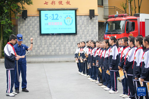 5月9日,消防救援人員給四川省眉山市彭山區(qū)第三中學(xué)的學(xué)生講解安全繩知識。(新華社發(fā) 翁光建 攝)