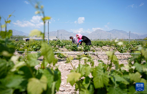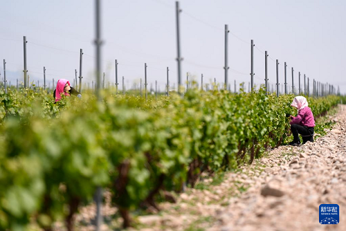 近日,寧夏賀蘭山東麓種植的釀酒葡萄進(jìn)入結(jié)果關(guān)鍵期,當(dāng)?shù)鼐魄f組織工人對(duì)葡萄藤進(jìn)行抹芽、剪枝等管護(hù)工作,以保證葡萄長(zhǎng)勢(shì)。