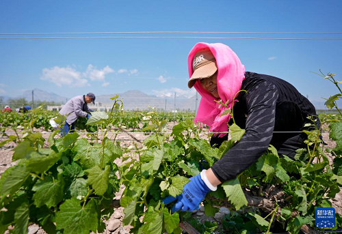 在位于寧夏銀川市賀蘭山東麓的海悅?cè)屎途魄f,工人在為葡萄藤抹芽、剪枝(5月9日攝)。(新華社記者 王鵬 攝)