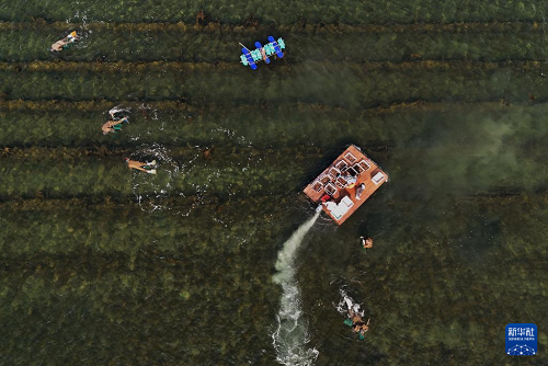 5月12日,河北省昌黎縣茹荷鎮(zhèn)一家海參養(yǎng)殖合作社的工人在捕撈海參(無人機(jī)照片)。(新華社記者 楊世堯 攝)