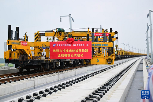 8月6日,在淮宿蚌城際鐵路鋪軌施工現(xiàn)場,中鐵一局施工人員將首對500米長鋼軌鋪設(shè)在無砟軌道上,這標(biāo)志著淮宿蚌城際鐵路全線開始鋪軌。