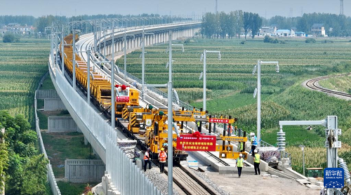 這是8月6日拍攝的淮宿蚌城際鐵路鋪軌施工現(xiàn)場。(新華社記者 周牧 攝)