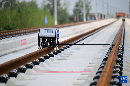 8月6日,智能螺栓機(jī)在淮宿蚌城際鐵路鋪軌施工現(xiàn)場自動(dòng)作業(yè)。(新華社記者 周牧 攝)