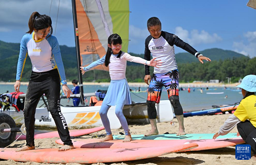暑期,許多游客來到海南三亞,學習體驗沖浪,感受與海共舞的樂趣。