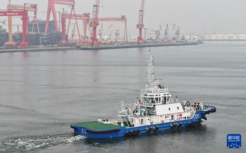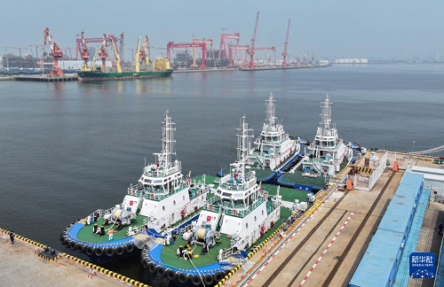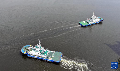 8月13日,由4艘純電動港作拖輪組成的“綠色艦隊”在中船天津碼頭鳴笛啟航。