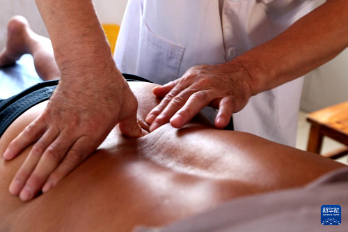 8月18日,在山東省臨沂市平邑縣溫水鎮(zhèn)衛(wèi)生院,中醫(yī)師為患者正骨推拿。(新華社發(fā) 武紀(jì)全 攝)