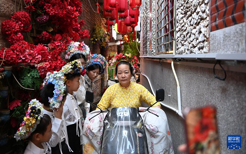 8月18日,福建泉州蟳埔村,一名蟳埔女騎電動(dòng)車從幾名體驗(yàn)“簪花圍”的游客前經(jīng)過。(新華社記者 肖瀟 攝)