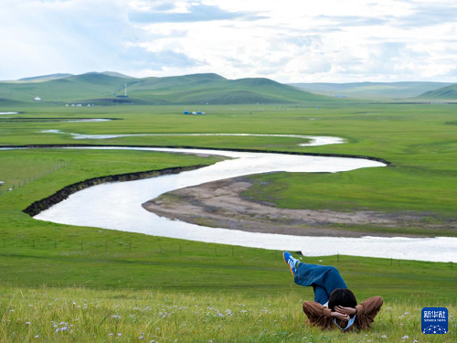 8月19日,在內蒙古呼倫貝爾市陳巴爾虎旗,游客躺在莫爾格勒河畔的草地上。(新華社記者 馬金瑞 攝)