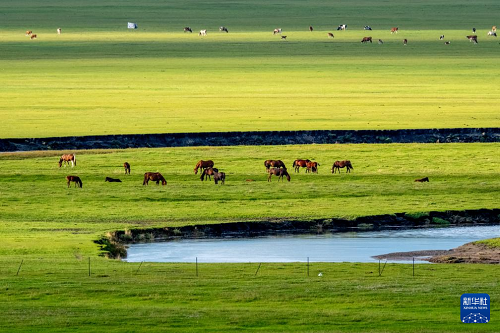 8月19日,在內蒙古呼倫貝爾市陳巴爾虎旗,馬群在莫爾格勒河畔吃草。(新華社記者 馬金瑞 攝)