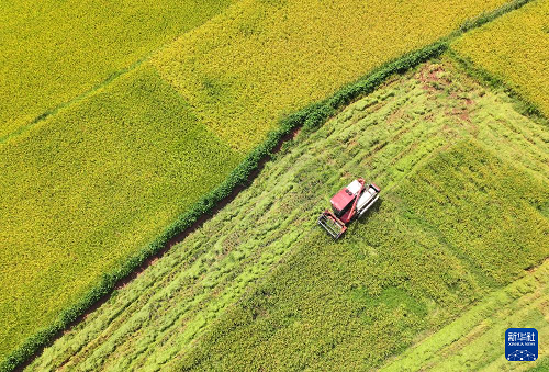 8月24日,在湖南省衡陽市祁東縣歸陽鎮(zhèn),煜東種養(yǎng)合作社的員工駕駛農(nóng)機(jī)在收割稻谷(無人機(jī)照片)。(新華社發(fā) 曹正平 攝)