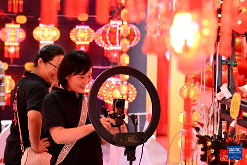 8月24日,商家在位于河北省正定縣的石家莊國際會展中心博覽會現(xiàn)場直播帶貨。(新華社發(fā) 陳其保 攝)