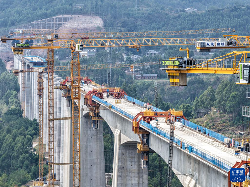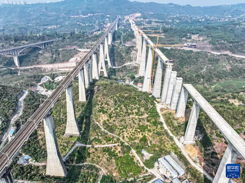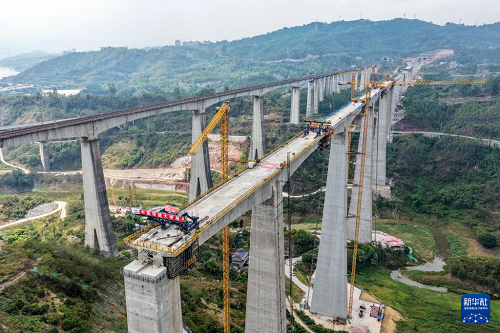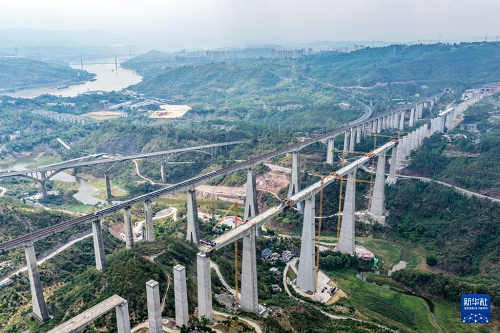 這是9月1日拍攝的渝萬高鐵蔡家溝雙線特大橋建設(shè)現(xiàn)場(chǎng)(無人機(jī)照片)。(新華社發(fā) 孫鵬 攝)