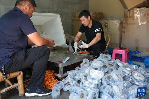 9月2日,在寧海的一家青蟹銷(xiāo)售網(wǎng)店,工作人員將青蟹裝箱快遞。(新華社記者 翁忻旸 攝)