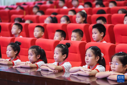 9月4日,北京師范大學(xué)南湖附屬學(xué)校的學(xué)生們在學(xué)校大講堂參加開學(xué)第一課《紅船精神》。(新華社記者 徐昱 攝)