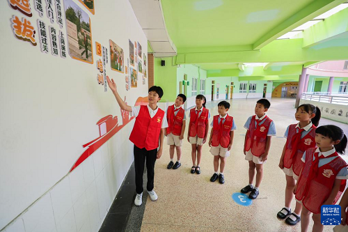 9月4日,北京師范大學(xué)南湖附屬學(xué)校的老師在給學(xué)生們講解“致敬禾城鐵血·同輝國旗榮光”——嘉興市新四軍老戰(zhàn)士抗戰(zhàn)英勇事跡圖版巡展的英雄事跡。(新華社記者 徐昱 攝)