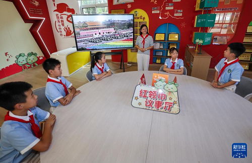 9月4日,浙江省“新時(shí)代好少年”、資深紅船小講解莫景鑠(左一)在嘉興市實(shí)驗(yàn)小學(xué)給新一批紅船小講解員傳授自己的講解經(jīng)歷和經(jīng)驗(yàn),同時(shí)也介紹了學(xué)校紅船小講解的歷史由來。(新華社記者 徐昱 攝)