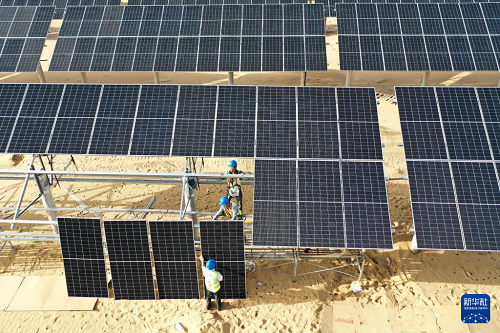 工人在庫布其沙漠里的杭錦旗朔方新能源大基地安裝光伏板(9月2日攝,無人機(jī)照片)。(新華社記者 李志鵬 攝)