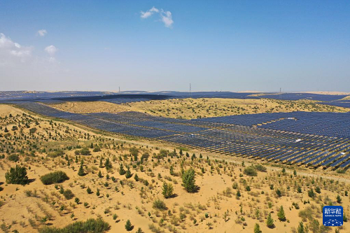 近年來,內(nèi)蒙古開展防沙治沙與風(fēng)電光伏一體化工程,推進(jìn)庫布其沙漠治理。目前,在鄂爾多斯市杭錦旗等庫布其沙漠北部地區(qū),一片片光伏基地在促進(jìn)新能源產(chǎn)業(yè)發(fā)展的同時(shí),成為當(dāng)?shù)厣鷳B(tài)治理、經(jīng)濟(jì)發(fā)展的堅(jiān)實(shí)屏障?!肮夥?生態(tài)治理”建設(shè)模式實(shí)現(xiàn)板上發(fā)電,板間、板下統(tǒng)籌兼顧特色生態(tài)修復(fù)、經(jīng)濟(jì)作物、造林綠化與技術(shù)創(chuàng)新,打造立體生態(tài)修復(fù)模式,讓沙海變成綠色電能涌動的“藍(lán)海”,實(shí)現(xiàn)生態(tài)效益與經(jīng)濟(jì)效益共贏。