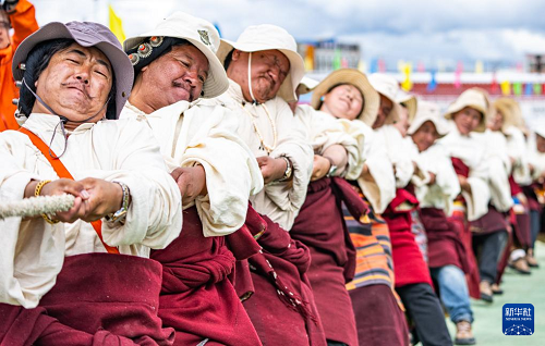9月6日,在那曲市恰青賽馬節(jié)現(xiàn)場,選手們參加拔河比賽。(新華社記者 丁增尼達 攝)