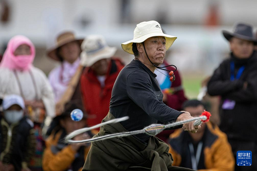 9月6日,在那曲市恰青賽馬節(jié)現(xiàn)場,一名選手們參加烏爾朵比賽。(新華社記者 姜帆 攝)
