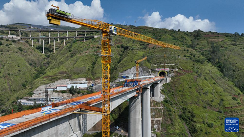 9月7日在云南省昭通市魯?shù)榭h江底鎮(zhèn)拍攝的渝昆高鐵江底牛欄江特大橋合龍現(xiàn)場(無人機(jī)照片)。(新華社發(fā) 張廣玉 攝)