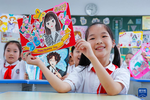 9月9日,天津市濱海新區(qū)塘沽實驗小學(xué)的學(xué)生將自己繪制的教師節(jié)畫作進(jìn)行布展。(新華社發(fā) 杜鵬輝 攝)