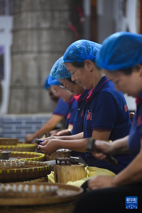 9月9日,在臨安龍崗鎮(zhèn)一家山核桃生產(chǎn)企業(yè),工作人員用山核桃空籽制作文創(chuàng)產(chǎn)品。(新華社記者 翁忻旸 攝)