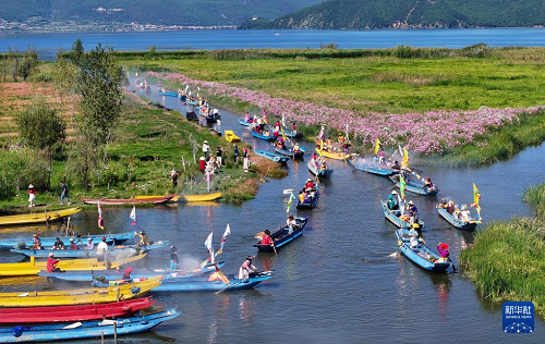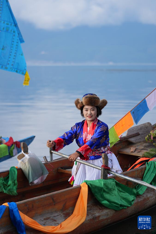 9月16日,當?shù)厝罕婑{著豬槽船從瀘沽湖的洛洼北碼頭開始轉(zhuǎn)海(無人機照片)。(新華社記者 江宏景 攝)