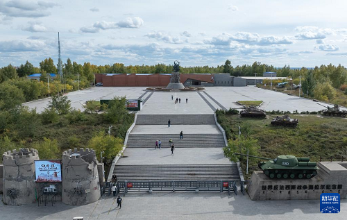 9月18日,人們?cè)趦?nèi)蒙古呼倫貝爾市海拉爾區(qū)世界反法西斯戰(zhàn)爭(zhēng)海拉爾紀(jì)念園參觀(無人機(jī)照片)。(新華社記者 貝赫 攝)