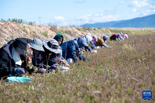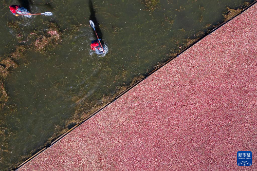 9月21日,在撫遠市蔓越莓種植基地,工作人員在采收蔓越莓。(新華社記者 張濤 攝)