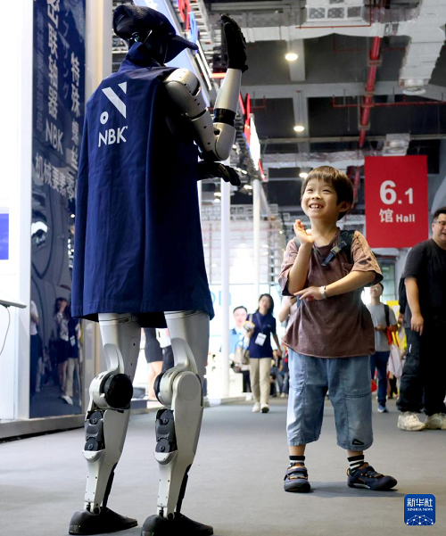 9月23日,小朋友在展會(huì)現(xiàn)場(chǎng)與人形機(jī)器人互動(dòng)。(新華社發(fā) 潘宗源 攝)