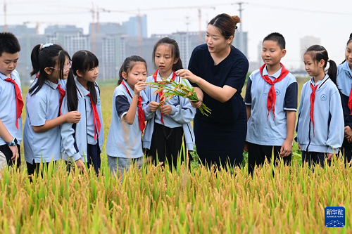 10月15日,江蘇省太倉(cāng)市港城小學(xué)老師為孩子們講解水稻生長(zhǎng)知識(shí)。(新華社發(fā) 計(jì)海新 攝)