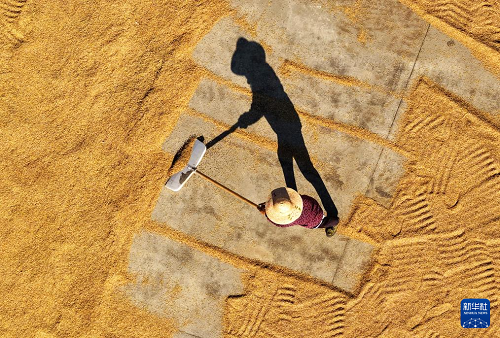 10月22日,農(nóng)民在江蘇里下河地區(qū)農(nóng)科所(揚(yáng)州市農(nóng)科院)晾曬稻谷(無(wú)人機(jī)照片)。(新華社發(fā) 孟德龍 攝)
