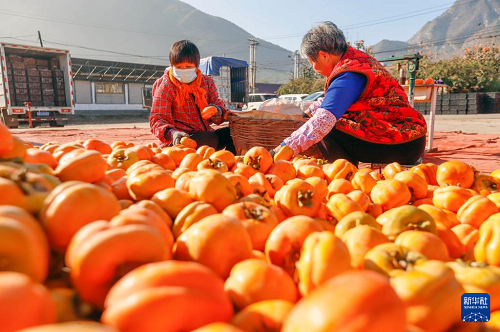11月1日,河北省遵化市娘娘莊鎮(zhèn)蘆各寨西山村農(nóng)民在場院挑選柿子。(新華社發(fā) 劉滿倉 攝)