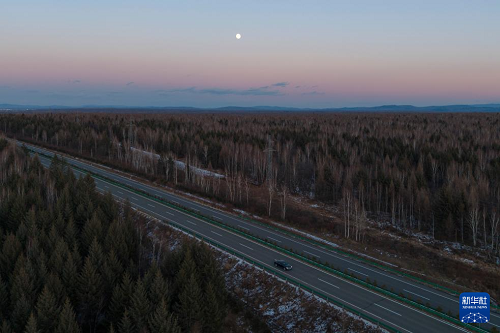 這是11月4日拍攝的黑龍江省伊春市豐林縣上空的月亮(無(wú)人機(jī)照片)。(新華社記者 謝劍飛 攝)