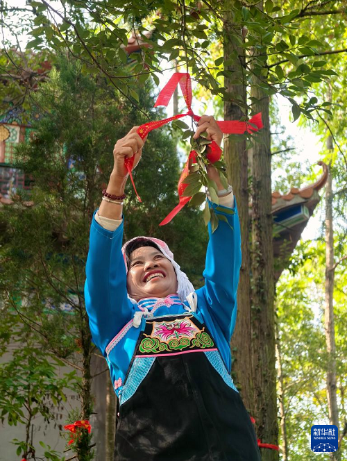 10月29日重陽節(jié),廣西南丹縣群眾按照傳統(tǒng)習(xí)俗在樹木上懸掛福壽帶。(新華社發(fā) 高東風(fēng) 攝)