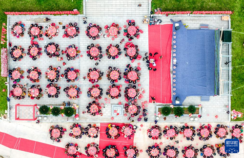 10月29日重陽節(jié),老人們在湖北省秭歸縣兩河口鎮(zhèn)太坪村參加長壽宴(無人機照片)。(新華社發(fā) 王罡 攝)