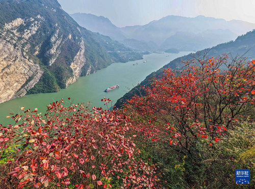 11月16日,船舶行駛在湖北省宜昌市秭歸縣西陵峽水域(無(wú)人機(jī)照片)。(新華社發(fā) 王罡 攝)