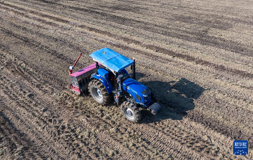 11月19日,在江蘇省常州市金壇區(qū)金城鎮(zhèn),農(nóng)機(jī)在田里播種小麥。(新華社發(fā) 陳暐 攝)